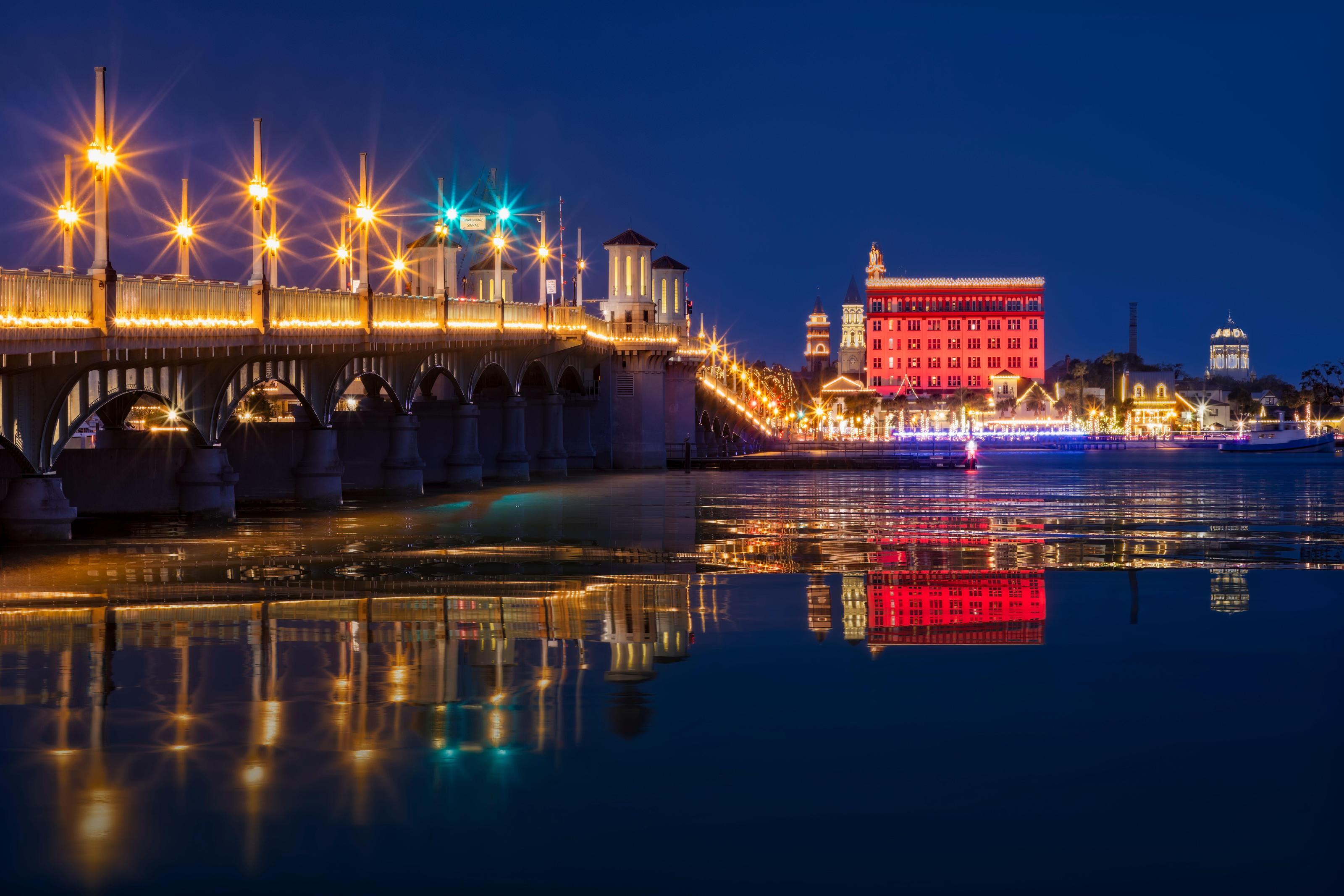 Bridge of Lions FL – View to the illuminated Lions bridge and historic St. Augustine during the Nights of Lights display.
